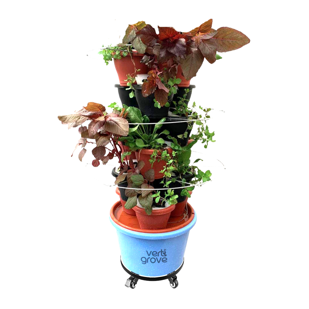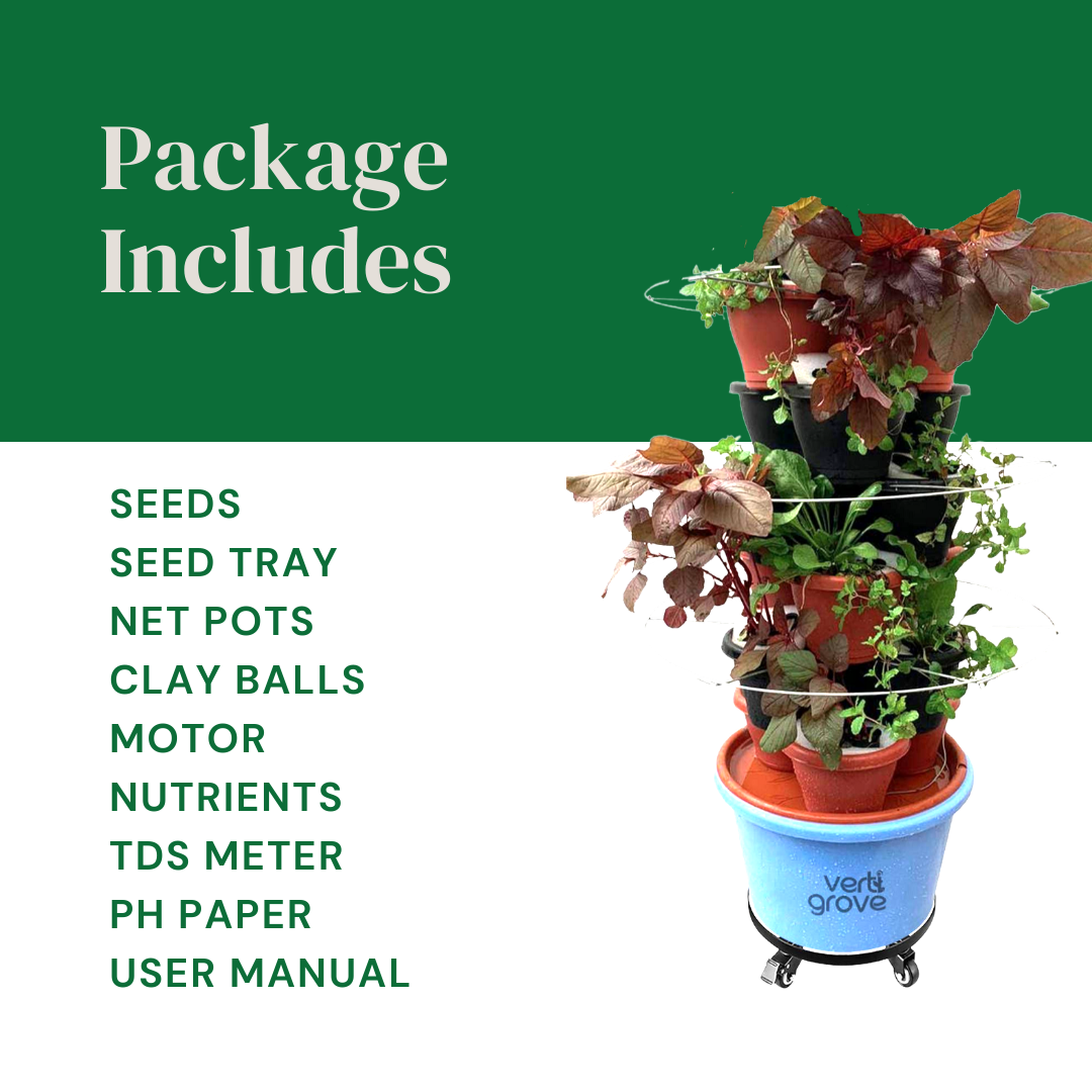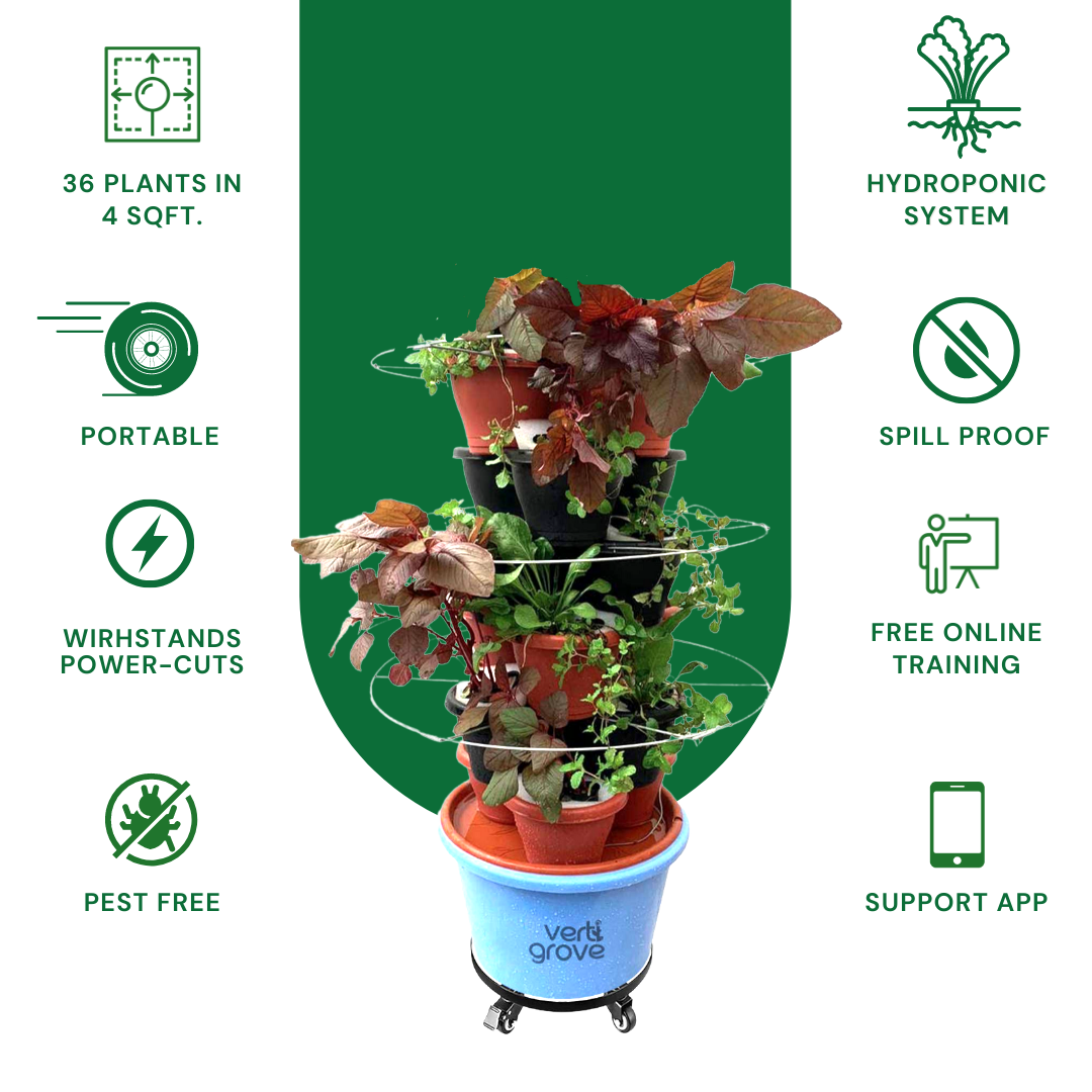 Vertigrove-Hydro Mini Tripot can grow upto 36 plants and is more suitable for growing fruiting vegetables such as tomatoes, long beans, lady’s fingers, etc. It is a portable unit and can withstand power cuts of upto 4 hrs.